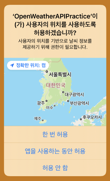 - .authorizedWhenInUse : 앱이 포그라운드 상태에서만 위치 서비스를 이용할 수 있도록 승인된 상태 (사용자가 앱을 사용 중일 때만 위치 서비스를 사용 가능)