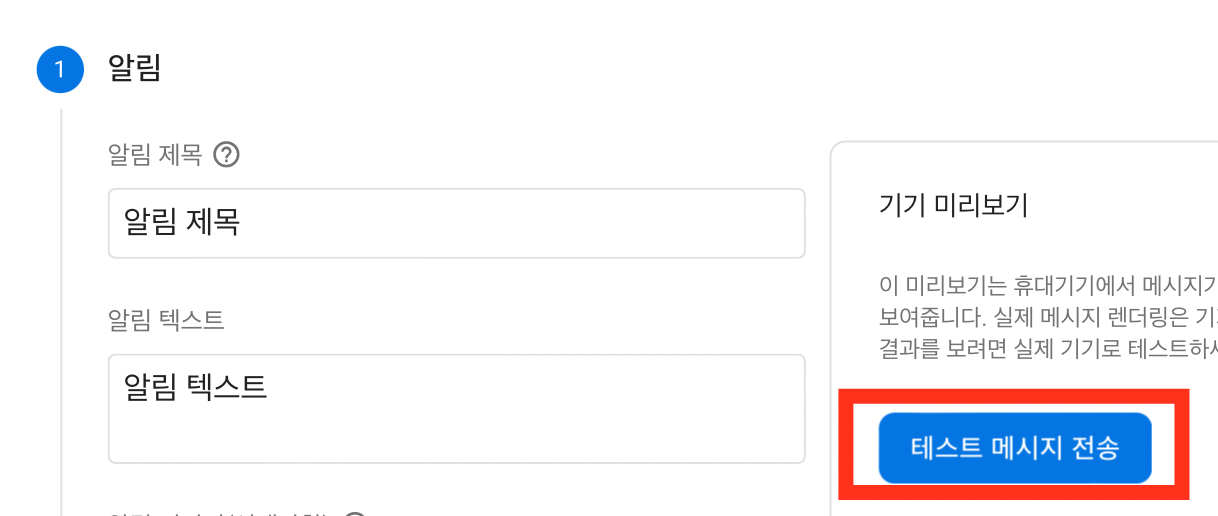 테스트 메시지 전송 > 콘솔에서 확인한 토큰을 입력 > 테스트