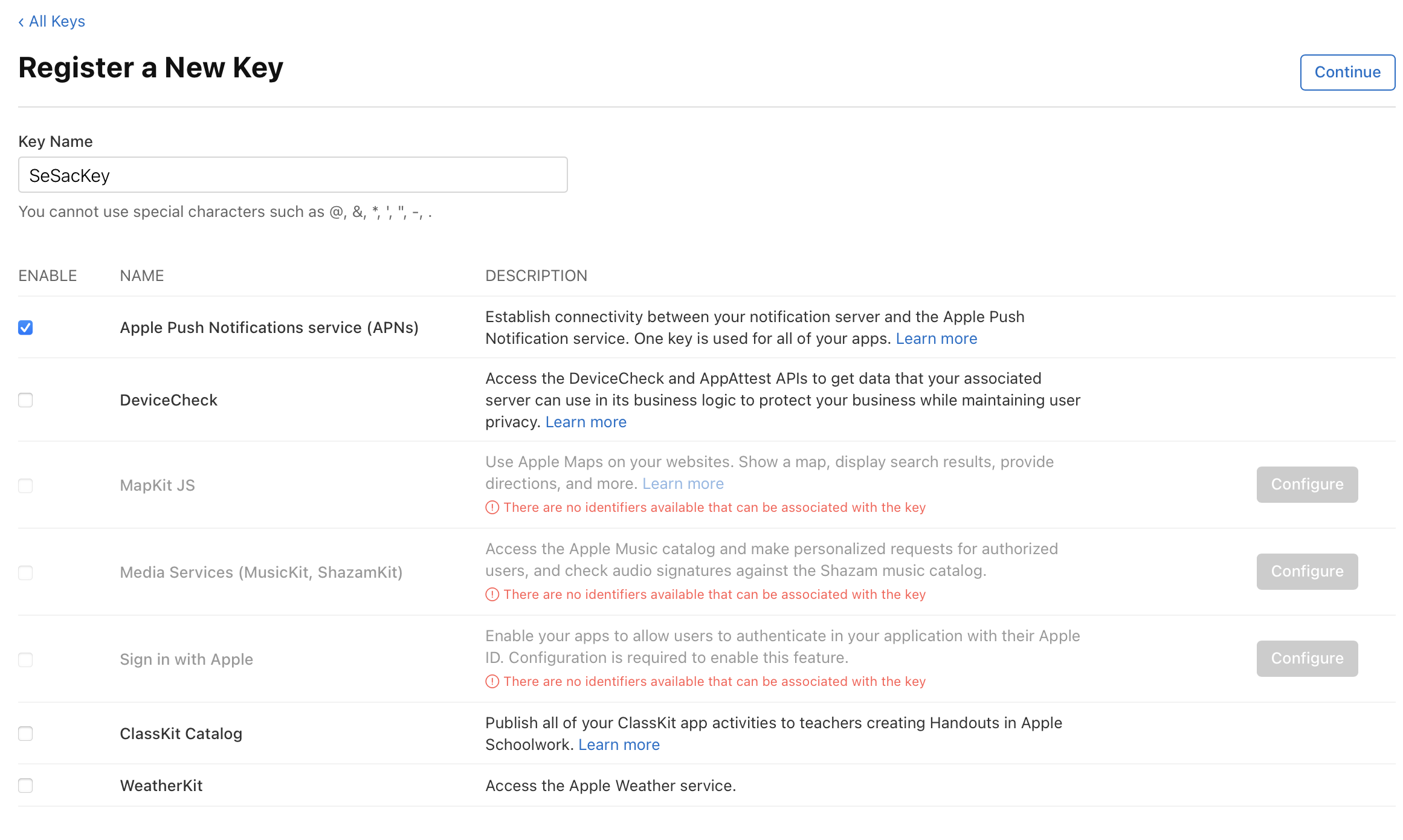 APNs를 사용하기 위한 Key는 애플 개발자 계정이 있어야 사용할 수 있다.