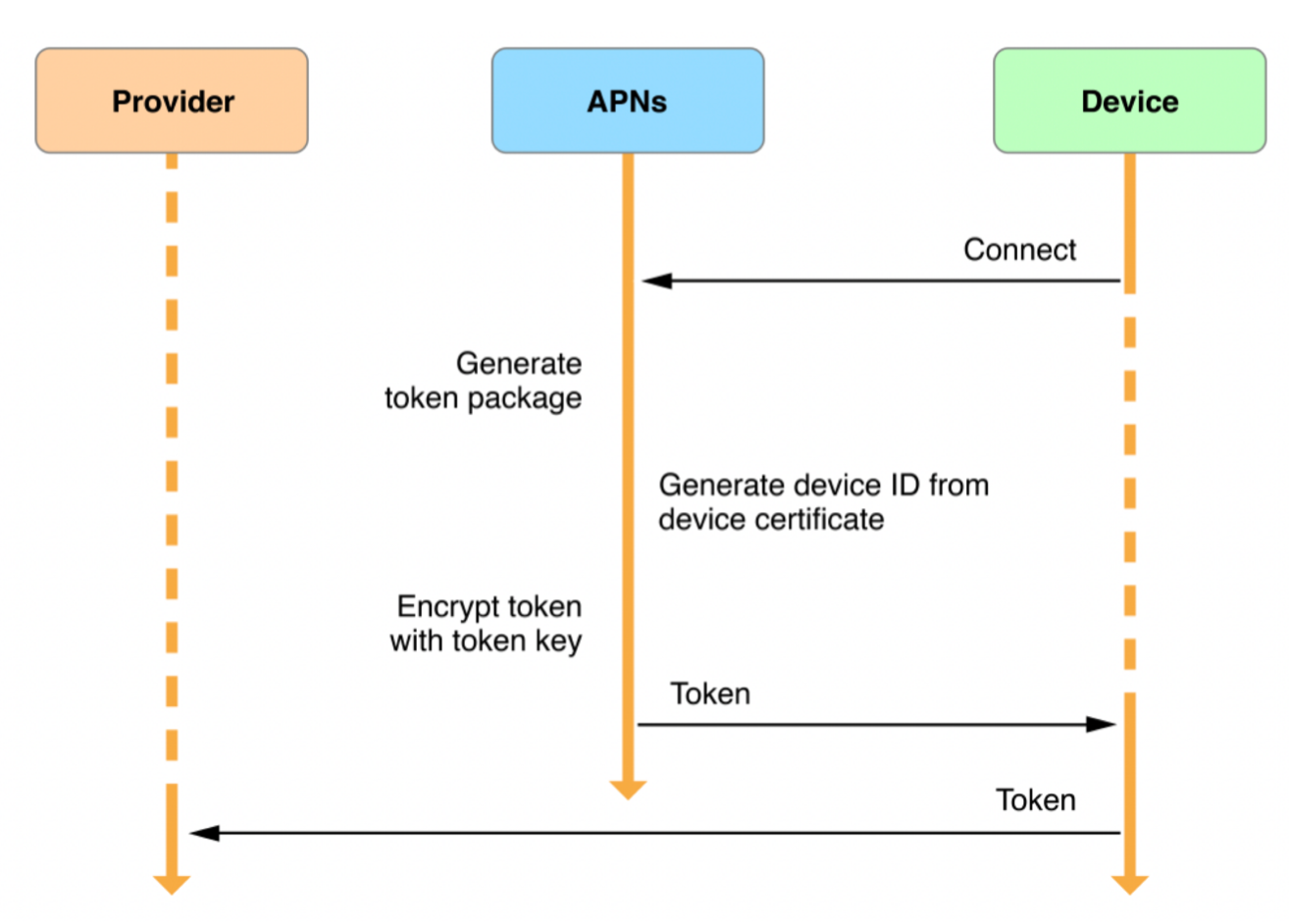 - Device는 APNs에게 발급받은 푸시 토큰을 Provider(Push를 보낼 서버)에게 전달